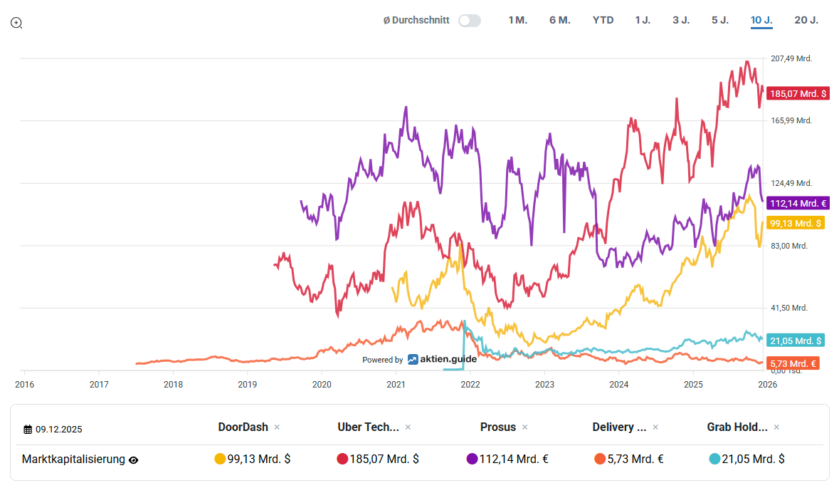 Die wichtigsten Akteure und Wettbewerber von DoorDash lassen sich sowohl auf nationaler als auch auf internationaler Ebene betrachten. In den USA, dem Kernmarkt von DoorDash, konkurriert das Unternehmen direkt mit Uber Eats und Grubhub sowie in geringerem Maße mit Postmates, das inzwischen in Uber Eats integriert wurde. Doch auch Grubhub ist schon lange nicht mehr eigenständig. Das Unternehmen war damals ein führender Akteur auf dem US-Markt, wurde jedoch 2020 von dem niederländischen Unternehmen Just Eat Takeaway für 7,3 Milliarden US-Dollar übernommen. Grubhub ist besonders stark bei städtischen Restaurants vertreten, technologisch jedoch weniger aggressiv im Bereich dynamischer Lieferalgorithmen. Der Preis für Grubhub war offensichtlich zu hoch, wie der anschließende Weiterverkauf von Just Eat Takeaway für 650 Millionen US-Dollar an die Wonder Group im Jahr 2024 zeigt. Die Normalisierung nach der Sonderkonjunktur durch die Corona-Pandemie sowie der zunehmende Wettbewerb durch kapitalstarke Wettbewerber ließ das Unternehmen abstürzen. Uber Eats hatte zwar auch zu kämpfen, konnte aber weiter durchstarten – dank einer starken Mutter (Uber), die unter anderem auch auf Fahrdienste setzt, gut kapitalisiert ist und Cross-Selling-Effekte ausnutzt. Ähnlich wie DoorDash nutzt Uber Eats eine Plattformstruktur, verbindet Kunden, Restaurants und Fahrer und setzt stark auf datengetriebene Logistikoptimierung. Doch DoorDash hat durch eine Kombination aus Marktdurchdringung in Vorstädten, exklusiven Restaurantpartnerschaften und eigenen Lieferkapazitäten einen strategischen Vorteil, den es über die letzten Jahre geschickt ausspielte. Auch wird es stärker auf der M&A-Seite: 2022 wurde mit Wolt beispielsweise für 8 Milliarden US-Dollar ein finnischer Lieferdienst übernommen. Es folgten 2025 der britische Lieferdienst Deliveroo für umgerechnet rund 3,9 Milliarden US-Dollar und SevenRooms für 1,2 Milliarden US-Dollar.