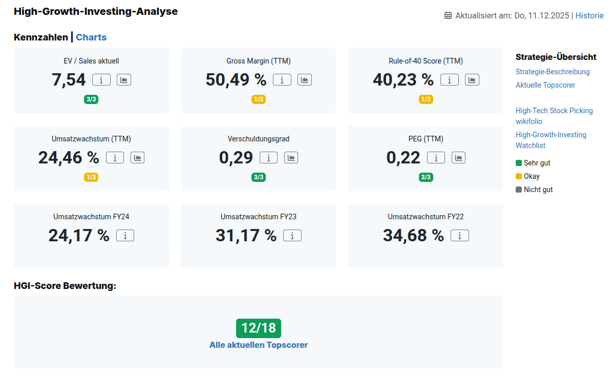 Mit einem aktuellen HGI-Score von 12 schneidet DoorDash aus Sicht eines wachstumsorientierten, quantitativ arbeitenden Investorenmodells solide ab, erreicht aber keinen absoluten Topwert. Dennoch ist die Aktie Bestandteil der Topscorer-Liste für Growth-Aktien. Der Score ergibt sich aus mehreren zentralen Faktoren, die die Balance zwischen Wachstum, Profitabilität, Effizienz und Risikoprofil widerspiegeln.