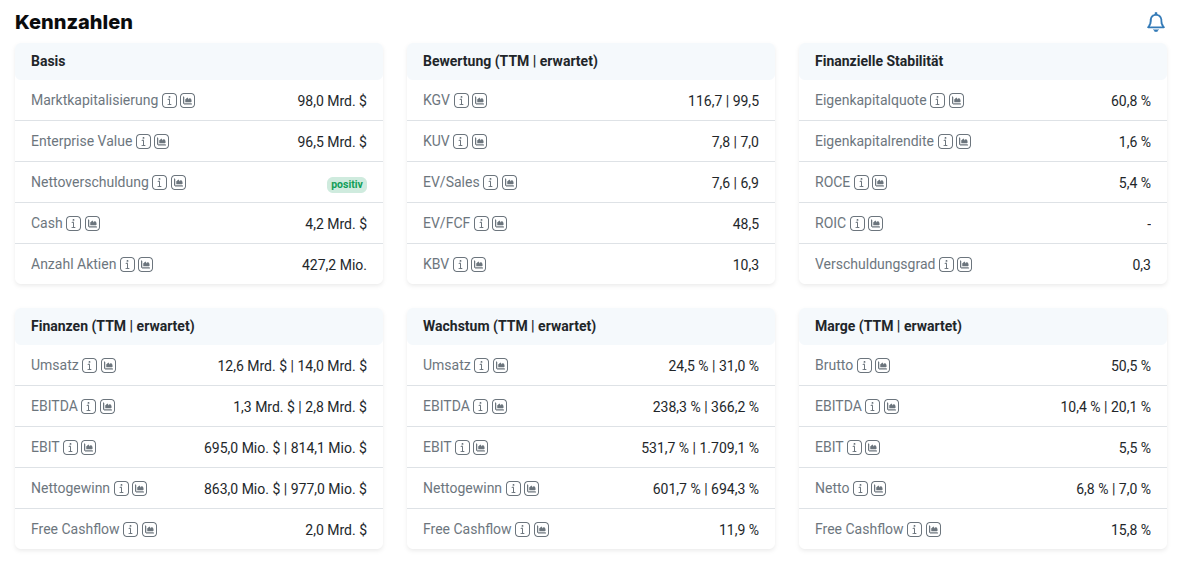 Analysten schätzen hingegen, dass der Umsatz des Konzerns im Gesamtjahr 2025 auf 14,1 Milliarden US-Dollar ansteigen wird, was einem Anstieg von rund 31 Prozent entspricht. Der Nettogewinn könnte dabei um 700 Prozent auf 977 Millionen US-Dollar steigen. Diese positive Entwicklung ist auf ein starkes Wachstum, unterproportionale Anstiege der Kostenbasis sowie gesenkte, aktienbasierte Vergütungen zurückzuführen.