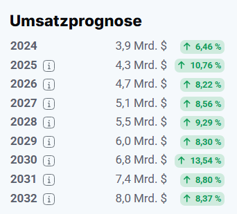 Der erwartete Umsatz im Jahr 2025 von ca. 4,3 Mrd. Dollar liegt rund 11 Prozent höher als der Umsatz 2024. Für das Jahr 2032 wird eine Steigerung auf 8 Mrd. Dollar erwartet. Dies entspricht einer jährlichen Wachstumsrate von 8 Prozent.
