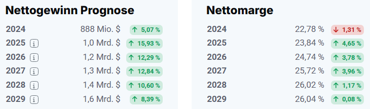 Für das aktuelle Geschäftsjahr liegt die durchschnittliche Erwartung des Nettogewinns bei 1 Mrd. Dollar. Die Nettomarge soll circa 24 Prozent betragen. Bis 2029 wird ein Ertragswachstum auf 1,6 Mrd. Dollar erwartet. Dies entspricht einer annualisierten Steigerung von 10 Prozent.