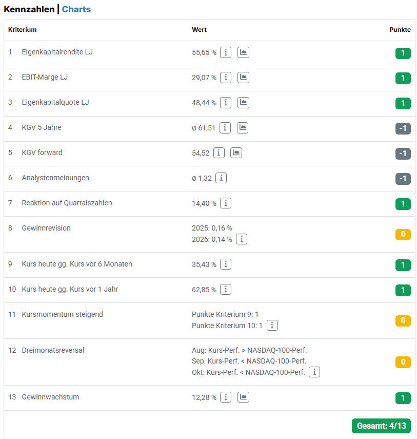 Für die Reaktion der Marktteilnehmer auf die letzten Quartalszahlen kommt ein weiterer Punkt hinzu. Auch für das Gewinnwachstum von 12 Prozent erhält das Wertpapier einen Punkt.