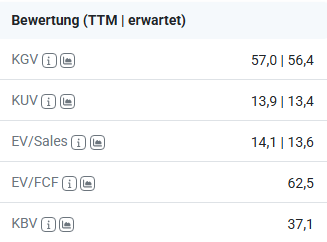 Mit einem KGV von fast 60 und einem EV/Sales von 14 ist ein gewisses Abwärtsrisiko aufgrund der hohen Multiples offensichtlich.