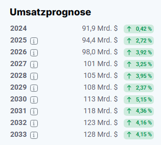 Für das Geschäftsjahr 2026 wird ein Umsatz in Höhe von 94,4 Mrd. Dollar erwartet. Dies wäre eine Steigerung um rund 3 Prozent. Für die Folgejahre soll die Steigerungsrate zwischen 3-4 Prozent betragen.
