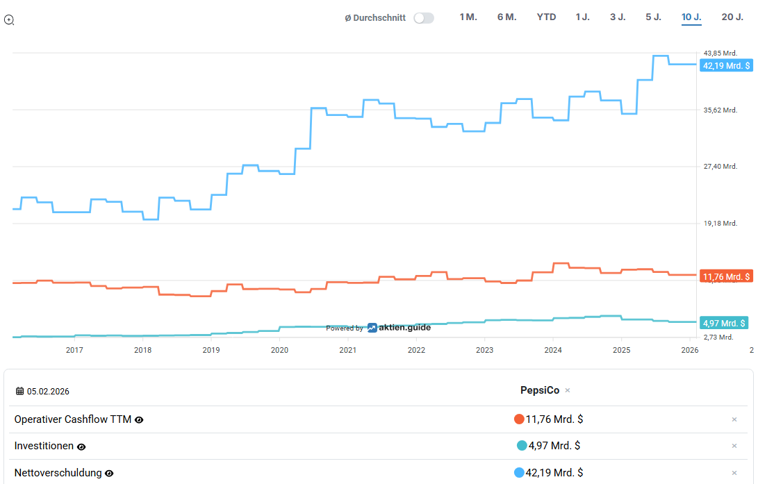 Aktuell beträgt die Nettoverschuldung im Verhältnis zum FCF einen Multiplikator von 5. Dies ist für ein kapitalintensives Unternehmen wie PepsiCo ein erhöhter Wert. Hier wäre ein Maximalwert von 4 als wünschenswert.
