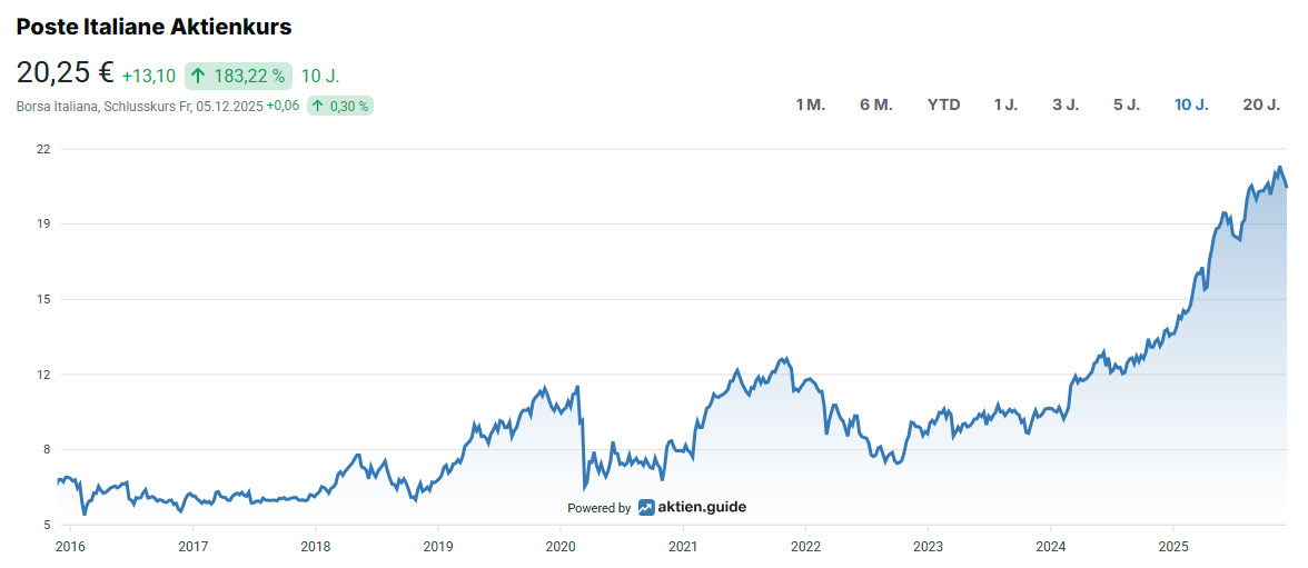 Megatrends wie die Digitalisierung, der Aufstieg des E-Commerce, die nachhaltige Energieversorgung und der demografische Wandel prägen die Wirtschaft heute mehr denn je – und eröffnen neue Chancen. Die italienische Poste Italiane (ISIN: IT0003796171) nutzt sie geschickt und profitiert direkt von den Entwicklungen. Die Digitalisierung von Dienstleistungen, der Ausbau der Paketlogistik durch den wachsenden Onlinehandel, die Entwicklung nachhaltiger Produkte und die verstärkte Nutzung künstlicher Intelligenz im Kundenservice positionieren das Unternehmen optimal am Markt. Hinzu kommt eine nahezu perfekt umgesetzte Strategie, die nicht mehr ausschließlich auf Logistik, sondern vielmehr auf umfassende Finanzdienstleistungen setzt. Der Aktienkurs reagierte prompt mit einem Kursplus von 185 Prozent im vergangenen Jahrzehnt.
