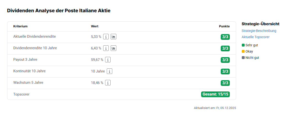 Die Dividendenanalyse stuft die Aktie der Poste Italiane als absoluten „Topscorer” ein. Mit der maximalen Gesamtpunktzahl von 15 Punkten wird sie in allen fünf untersuchten Kriterien als herausragend bewertet, was überaus selten vorkommt. Diese konsistente Spitzenleistung macht die Aktie für dividendenorientierte Anleger potenziell attraktiv und sie erhält im Rahmen der zugrunde liegenden Strategie das Prädikat „Sehr gut”.
