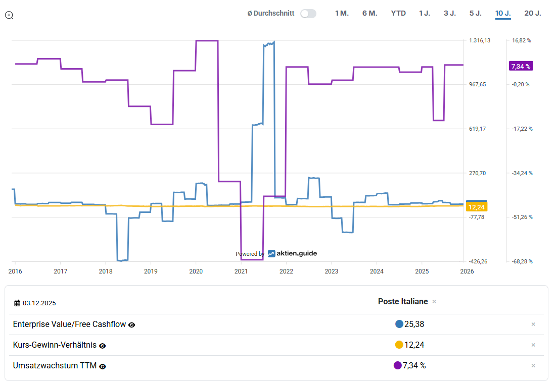 Die Wachstumsprognosen untermauern die positive Einschätzung. Zwar sinkt das erwartete Umsatzwachstum von jüngst 7,3 Prozent auf 2,2 Prozent, was eine Normalisierung der Wachstumsdynamik andeutet. Viel wichtiger und erfreulicher für Anleger ist jedoch die Prognose, dass der Nettogewinn deutlich zweistellig zulegen soll, mit einem erwarteten Plus von 15,3 Prozent. Diese Diskrepanz zwischen Umsatz- und Gewinnwachstum ist ein starkes Zeichen für eine verbesserte operative Effizienz und eine gestärkte Profitabilität des Unternehmens. Gleichzeitig dürfte das langfristig nur moderate Wachstum aber einer der Hauptgründe dafür sein, dass die Bewertung so niedrig ausfällt. Auch wirken sich makroökonomische Unsicherheiten belastend aus. Hohe geopolitische Spannungen, Schwankungen im internationalen Handel, die volatile Konjunktur in Italien und global erhöhen das wahrgenommene Risiko und dämpfen die Bewertung. Drittens stehen strukturelle Herausforderungen im Kerngeschäft der Post- und Logistikdienstleistungen im Raum. Der traditionelle Briefversand befindet sich im langfristigen Rückgang, und die Transformation hin zu einer stärker parcel- und digitalorientierten Logistik erfordert Investitionen und trägt kurzfristig zu einer vorsichtigen Marktbeurteilung bei. Schließlich könnte die aktuelle Bewertung auch durch konservative Erwartungen hinsichtlich der langfristigen Wachstumsraten in den Finanz- und Versicherungssegmenten beeinflusst sein, obwohl diese Bereiche weiterhin stabile Cashflows und attraktive Gewinnsteigerungen liefern.