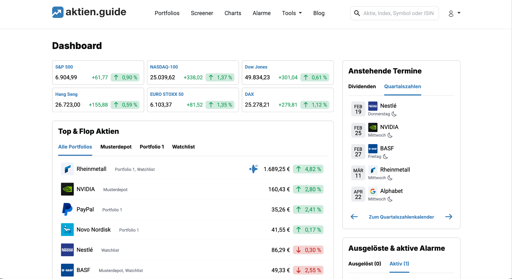 Du legst Aktien in Portfolios, setzt Alarme und bekommst Updates automatisch geliefert. Das ist der Teil, der Zeit spart und gleichzeitig deine Ergebnisse verbessert, weil du konsequent deine Strategie verfolgst.