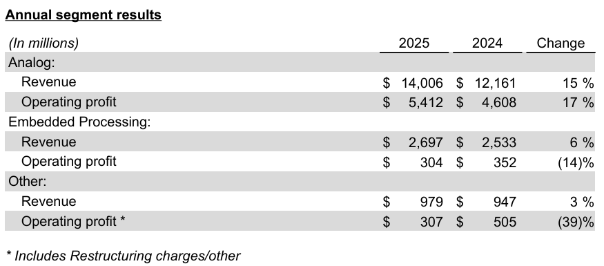 Der Umsatz von Texas Instruments setzt sich aus den Bereichen Analog, Embedded und Other zusammen. Er lag 2025 bei insgesamt 17,68 Mrd. Dollar. Mit einem Anteil von rund 80 Prozent dominieren die analogen Halbleiter. Dieses Segment konnte auch ein Umsatzwachstum von 15 Prozent auf 14 Mrd. Dollar vorweisen.