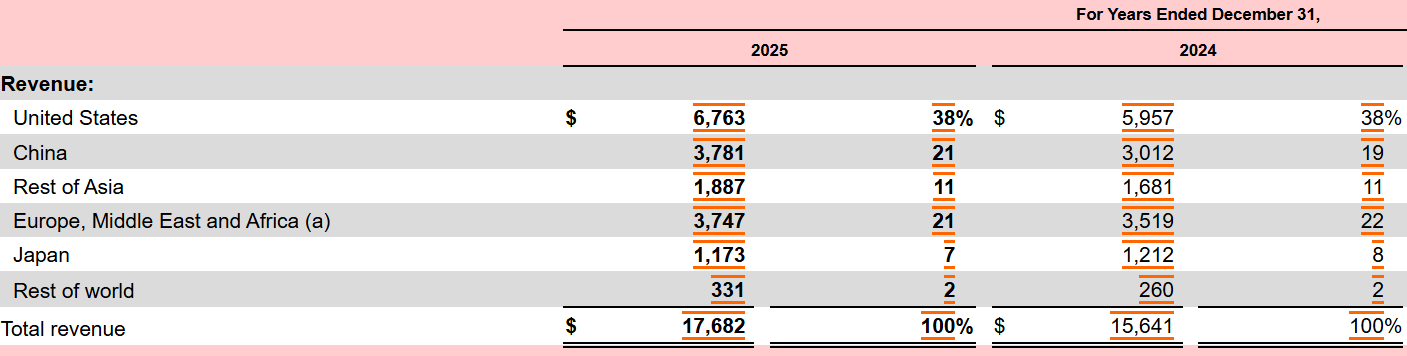 Mit 38 Prozent liegt der Schwerpunkt deutlich auf den USA. Dahinter folgen EMEA (Europa, Mittlerer Osten und Afrika) und China mit je 21 Prozent und die restlichen Staaten Asiens (außer Japan) auf 11 Prozent. Japan allein erreicht 7 Prozent und alle weiteren Länder zusammen erzielen 2 Prozent.