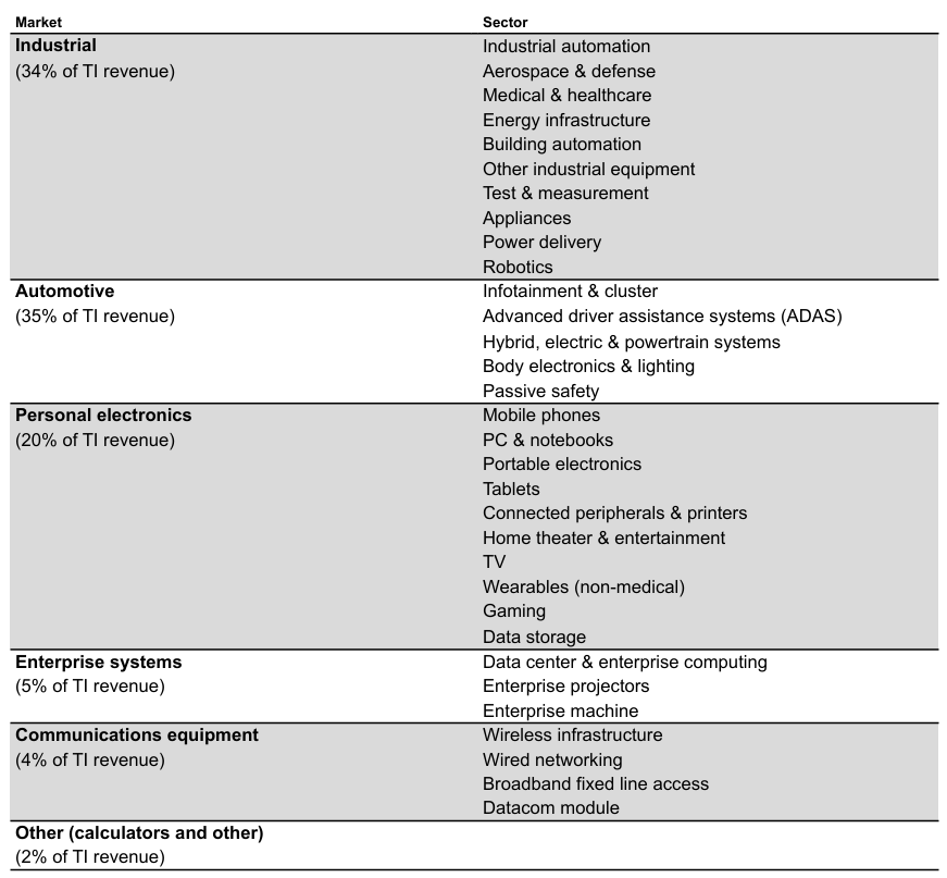 Hier erstreckt sich das Angebot von Schaltlösungen für Infotainment-Systeme über Fahrerassistenzsysteme zu Fahrzeugbeleuchtung und Sicherheitswarnsystemen. Im Industriebereich ist Texas Instruments in den Bereichen automatisierte Produktion vertreten und bietet außerdem Chips für die Energie-Infrastruktur und für Robotik an. Auf 20 Prozent Anteil kommen Halbleiter für Elektrogeräte (Personal electronics), wie Computer, TV, Handys, Konsolen, Drucker und viele weitere. Hier liegt der Schwerpunkt auf kabellosen Schaltlösungen wie WiFi oder Bluetooth.
