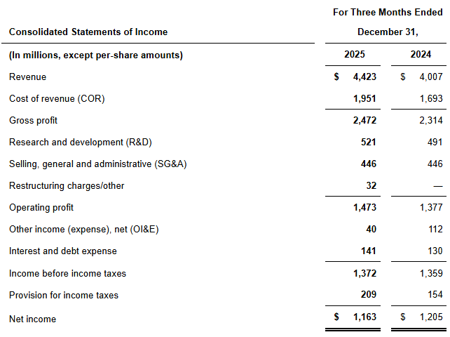 Der Umsatz stieg um 10 Prozent auf 4,42 Mrd. Dollar. Die Produktkosten stiegen dagegen um 15 Prozent, sodass ein Rohertrag von 2,47 Mrd. Dollar verblieb. Dies entsprach einer Steigerung um 7 Prozent im Vergleich zum Vorjahresquartal. Durch höhere Abschreibungen und eine Ausweitung der Kosten für Forschung und Entwicklung stieg das EBIT noch um 9 Prozent auf 1,5 Mrd. Dollar.