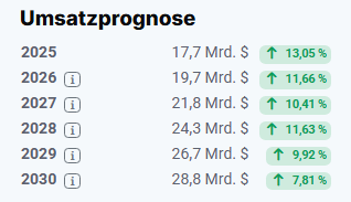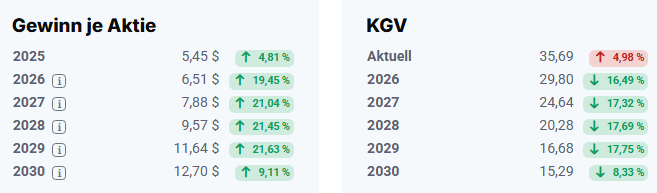 Für den Gewinn pro Aktie (EPS (TTM) einfach erklärt) sind Analysten für die nächsten Jahre noch optimistischer. Es werden jährliche Steigerungsraten zwischen 19 und 21 Prozent erwartet.