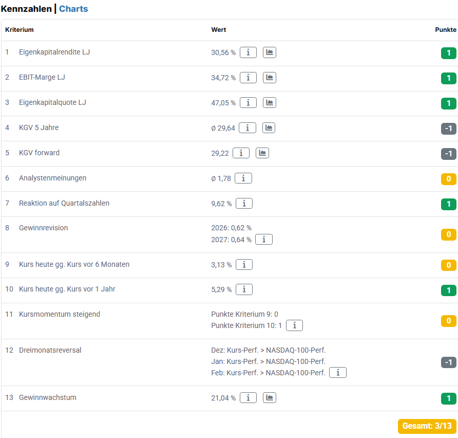 Jeweils einen Punkt erhält die Aktie für die Eigenkapitalrendite von 30 Prozent, für die Eigenkapitalquote von 47 Prozent und für die EBIT-Marge von ca. 35 Prozent.