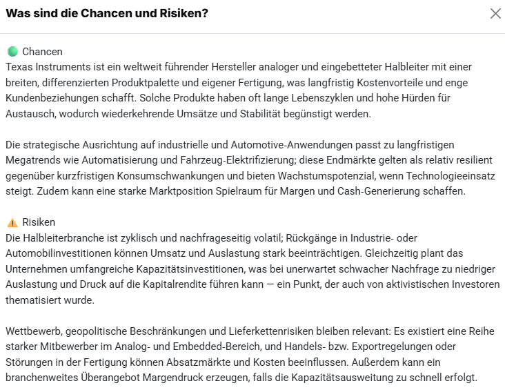 Allerdings ist Texas Instruments auch sehr stark von zyklischen Sektoren abhängig. Sollte die Nachfrage zurückhaltend bleiben, lassen sich diese Prognosen nicht einhalten.