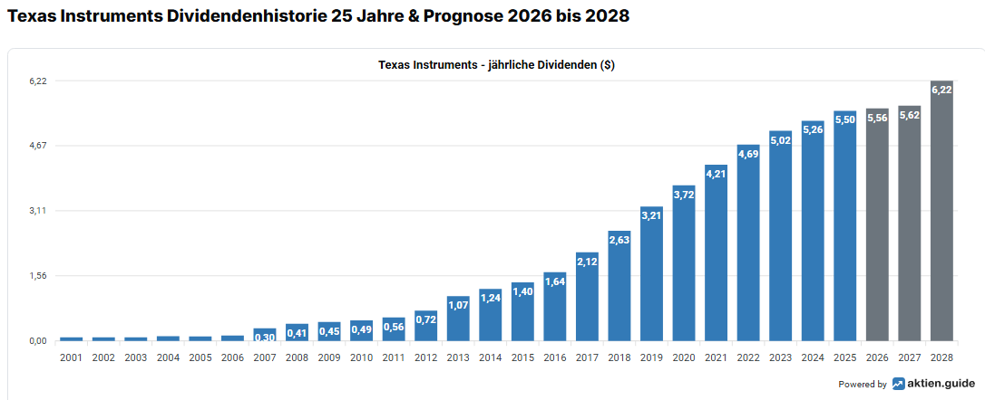 Bei Texas Instruments sind Analysten für die kommenden Jahre optimistisch. Es wird für 2026 bis 2028 ein zweistelliges Umsatzwachstum erwartet.