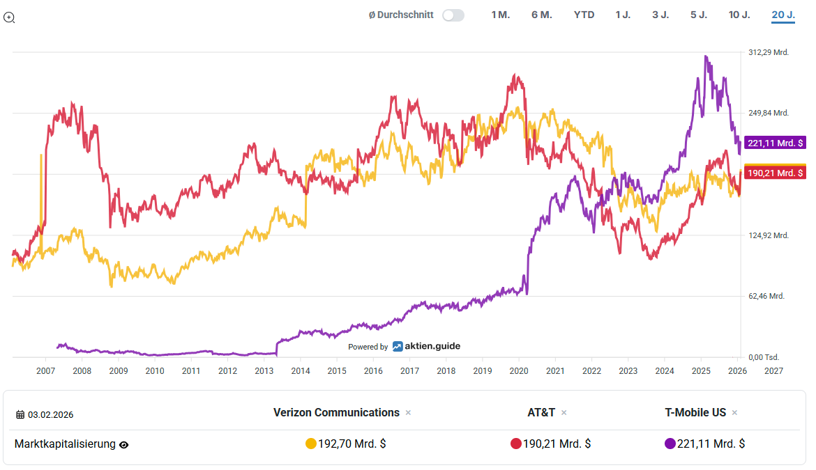 Der wichtigste Wettbewerber von Verizon ist ganz klar AT&T. Der Telekommunikationsriese ist ähnlich breit aufgestellt und bietet sowohl Mobilfunk- als auch Festnetzdienste für Privat- und Geschäftskunden an. Wie Verizon verfügt AT&T über ein landesweites Mobilfunknetz in den USA und konkurriert direkt um dieselben Kundengruppen. Der Wettbewerb zwischen den beiden Unternehmen findet vor allem über Netzqualität, Preisgestaltung und Serviceangebote statt. Dabei positioniert sich AT&T etwas breiter, während Verizon stärker auf Netzqualität und Zuverlässigkeit setzt. Ein weiterer zentraler Wettbewerber ist T-Mobile US. T-Mobile hat in den vergangenen Jahren stark an Bedeutung gewonnen, insbesondere nach der Fusion mit Sprint. Es verfolgt eine aggressivere Preispolitik und spricht junge, preisbewusste Kunden an. Das Wachstum geht dabei zu Lasten der beiden großen etablierten Wettbewerber. Seit Jahren wächst T-Mobile US stärker als der Gesamtmarkt und zwingt etablierte Anbieter wie Verizon, ihre Tarife und Angebote regelmäßig anzupassen. Mit einer Marktkapitalisierung von über 220 Milliarden US-Dollar ist T-Mobile US mittlerweile der wertvollste Telekommunikationskonzern in den USA. Aber auch global gesehen ist es der am höchsten kapitalisierte Mobilfunkkonzern der Welt. Doch die Erfolgsstory ist seit Anfang 2025 erst einmal ins Stocken geraten.