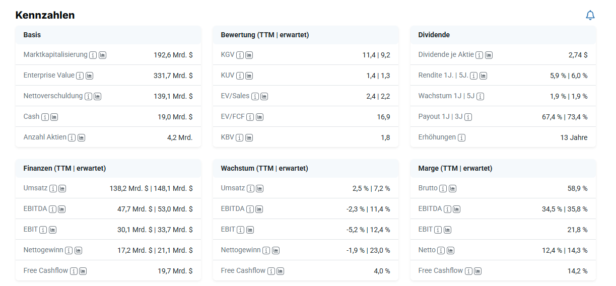 Bei einem erwarteten KGV von 9,2 und einem prognostizierten Umsatzwachstum von 7,2 Prozent könnte für die Verizon-Aktie ein attraktives Preis-Leistungs-Verhältnis vorliegen. Auch der Multiplikator auf die Cashflows (EV/FCF) mit einem Wert von 16,9 signalisiert eine bezahlbare Bewertung. Die Nettoverschuldung von fast 140 Milliarden US-Dollar erscheint angesichts eines stabilen EBITDA von erwartet über 50 Milliarden US-Dollar tragbar. Attraktiv sind auch die Renditen auf das eingesetzte Kapital mit einer Eigenkapitalrendite von 16,4 Prozent und einem ROCE von 8,8 Prozent.
